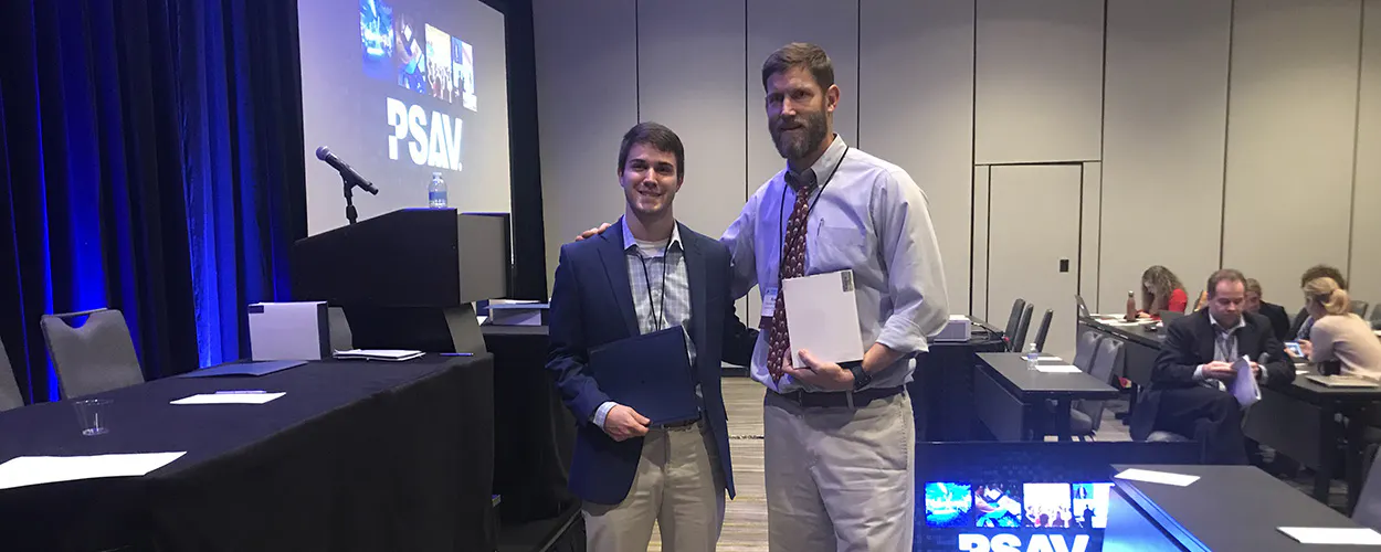 The organization also gave the Promising Career Award to Landon Lempke, a second-year doctoral student and research assistant in the UGA Concussion Research Lab, which Schmidt co-directs with Rob Lynall. Lempke received the award based on his abstract, "Comparison of Head Impact Biomechanics Between Tackle and Flag Youth Football."